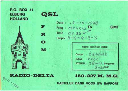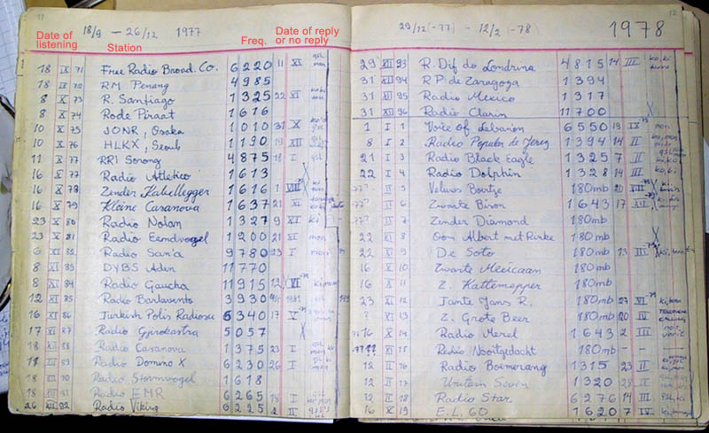 Mijn allereerste Nederlandse MG piratenzender die ik ontvangen heb, was Radio Napoleon International uit Dedemsvaart. Van hem heb ik mijn eerste ontvangst bevestiging gekregen voor een uitzending op de 1319 kHz in 1976. (Klik hier voor een geluidsfragment van Radio Napoleon Int.) Het eerste station op de 180 meterband die mij een ontvangst bevestiging stuurde was de Houston uit Finsterwolde. Het was geloof ik niet de eerste piratenzender die ik ontvangen had, maar zeker in de begin tijd had ik veel moeite om de stations namen te herkennen, omdat ik bijna geen Nederlands verstond. Later begreep ik hoe men te werk ging en werd het interessant om een station naam te horen en een lokatie. Ik denk dat Steenwijk de meeste actieve MG amateurs had eind jaren 70. Ik denk dat ik ongeveer 500 verschillende MG amateurs ontvangen heb. Veel daarvan heb ik nooit kunnen identificeren vanwege het slechte ontvangst waar ik veel mee te kampen had. Ik heb ongeveer 300 rapporten/brieven verstuurd en kreeg ongeveer 200 bevestigingen daarvan terug. Daardoor heb ik honderden stickers, QSL kaarten en postkaarten van dorpjes uit Drenthe, Overijssel en Groningen. Het was erg moeilijk om adressen te vinden of te krijgen van de MG piraten. In 1977 heb ik veel hulp gekregen van de Kleine Casanova uit Elburg, die via een door mij opgestuurde bandje en het afluisteren daarvan, achter de desbetreffende piratenzender kwam. Hij gaf nooit adressen, maar stuurde mijn rapporten door naar de desbetreffende piratenzender, waarvoor nog steeds hartelijke dank !! Ook Radio Napoleon hielp me met mijn probleem, door het sturen van wat lijsten met adressen. Later begon ik adressen te vragen aan andere piratenzenders die ik aangeschreven had. Hierdoor kreeg ik vaak toch weer een nieuw adres erbij.