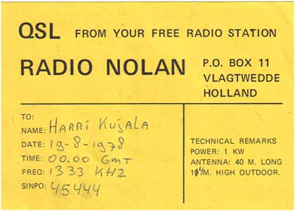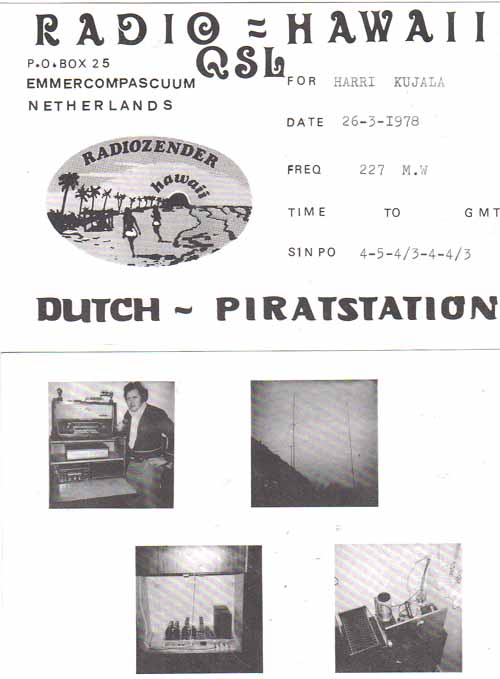 Helaas heb ik nog nooit een Nederlandse piratenzender bezocht, iets waar ik tot op de dag van vandaag spijt van heb. Het zou een onvergetelijke reis zijn geweest, om zoveel piratenzenders te bezoeken en om ze eens mee te maken als ze in de lucht waren. Helaas waren mijn DX vrienden niet zo blij met de Nederlandse MG piraten, dus had ik die reis alleen moeten doen. En dat is er dus nooit van gekomen. Misschien ooit nog eens, in de toekomst ?? Wie zal het zeggen.... Harri Kujala, een begrip voor de Nederlandse MG amateur. Jarenlang heeft hij zich verdiept in de gang van zaken en met vele van deze amateurs heeft hij een geruime tijd contact gehad. Speciaal voor Etherpiraten.com heeft hij al zijn spullen en herinneringen bij elkaar gezocht en heeft daar een aantal Internet pagina's over gemaakt. Deze pagina's kunnen hier bekeken worden. Namens Harri, moesten wij alle MG piraten bedanken voor hun platen en mocht er iemand zijn die Harri nog kent van vroeger en misschien nog wel een rapport van hem heeft gehad, kan contact met hem of met ons opnemen, aangezien Harri toch leuk leek om weer wat van de bekende piratenzenders te spreken. Je kan Harri bereiken door het sturen van een Emailtje naar hem.. |