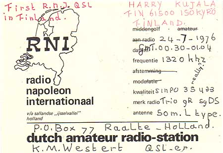 Mijn naam is Harri Kujala, woon in een klein plaatsje Naantali, 15km van Turku verwijderd en ben inmiddels getrouwd en heb twee kinderen. Ik begon met DXen in 1973 en voornamelijk naar stations uit Zuid Amerika. Tijdens onze ontvangst sessies, kwamen wij ook wel eens Nederlandse MG piraten tegen. De interesse was gewekt en begon ook intensief naar deze zogenaamde piratenzenders te luisteren. De meest actieve tijd dat ik echt veel naar de Nederlandse MG piraten heb geluisterd was van 1977 tot 1981.