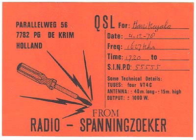In die tijd hadden ik en wat vrienden ook een eigen piratenzender op de KG. Zo nu en dan waren wij aan de band via de 48 meterband, 6205 kHz. We kregen honderden brieven van luisteraars uit heel Scandinavië. We sloten het station in 1981, omdat in 1980 tien andere piratenzenders uit de lucht waren gehaald in Finland. De boetes in Finland lagen toen al rond de 5000 Euro's. Gelukkig zijn wij niet uit de lucht gehaald, dankzij het gebruik van een mobiele zendlokatie. Wat voor ontvangers en antenne's gebruikte je in die dagen om Nederlandse MG amateurs te ontvangen ?? Ik gebruikte een TRIO 9R-59DS ontvanger met 40 meter draad als antenne. Als ik me goed herinner, heb ik in 1979 de antenne veranderd van 40 meter naar 150 meter, wat een veel beter ontvangst opleverde op de 180 meterband.