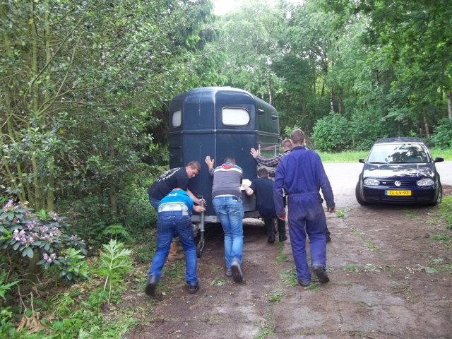 Oude paardentrailer aan de straat drukken zodat er plaats was voor de andere trailer,