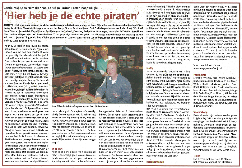 De titel van het verhaal is: Zendpiraat Koen Nijmeijer haalde Mega Piraten Festijn naar Tilligte.